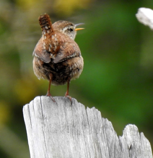After passing the farm buildings a Wren was in good voice on a wall.